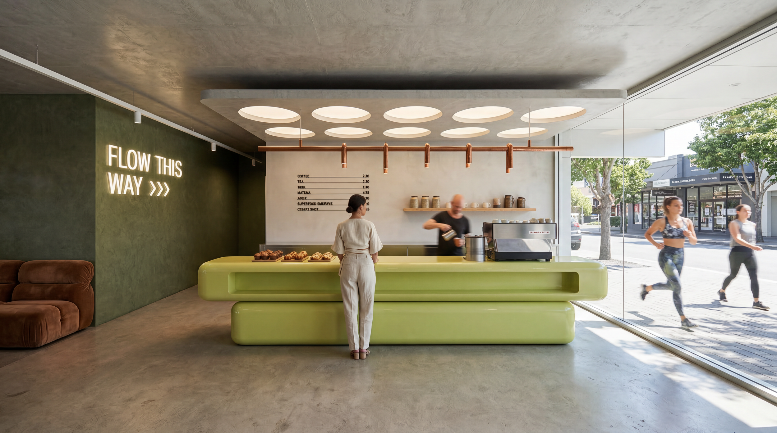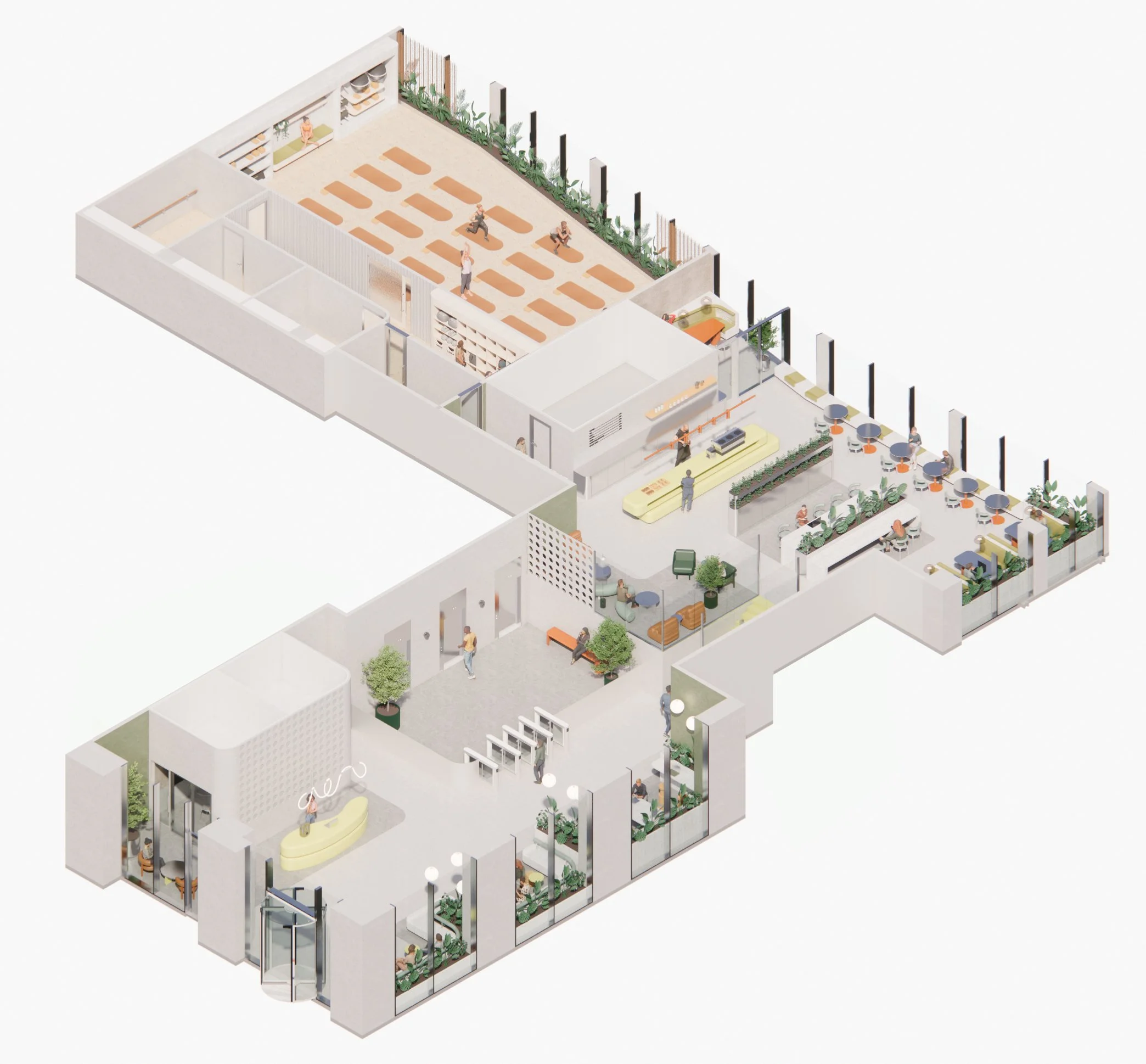 At ground level, a reception, coworking lounge and juice bar create an active, social hub that encourages interaction and dwell time. This is supported by a range of bookable spaces, including small offices and treatment rooms, offering flexibility for a variety of occupiers and uses.